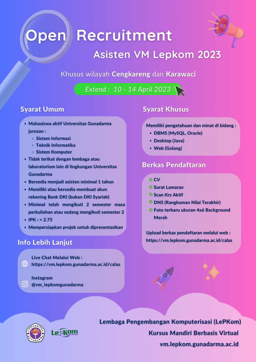 PERPANJANGAN WAKTU PENDAFTARAN REKRUTMEN ASISTEN LEPKOM 2023 [KARAWACI - CENGKARENG] OPEN RECRUITMENT ASISTEN LEMBAGA PENGEMBANGAN KOMPUTERISASI (LEPKOM) KURSUS MANDIRI BERBASIS VIRTUAL 2023
