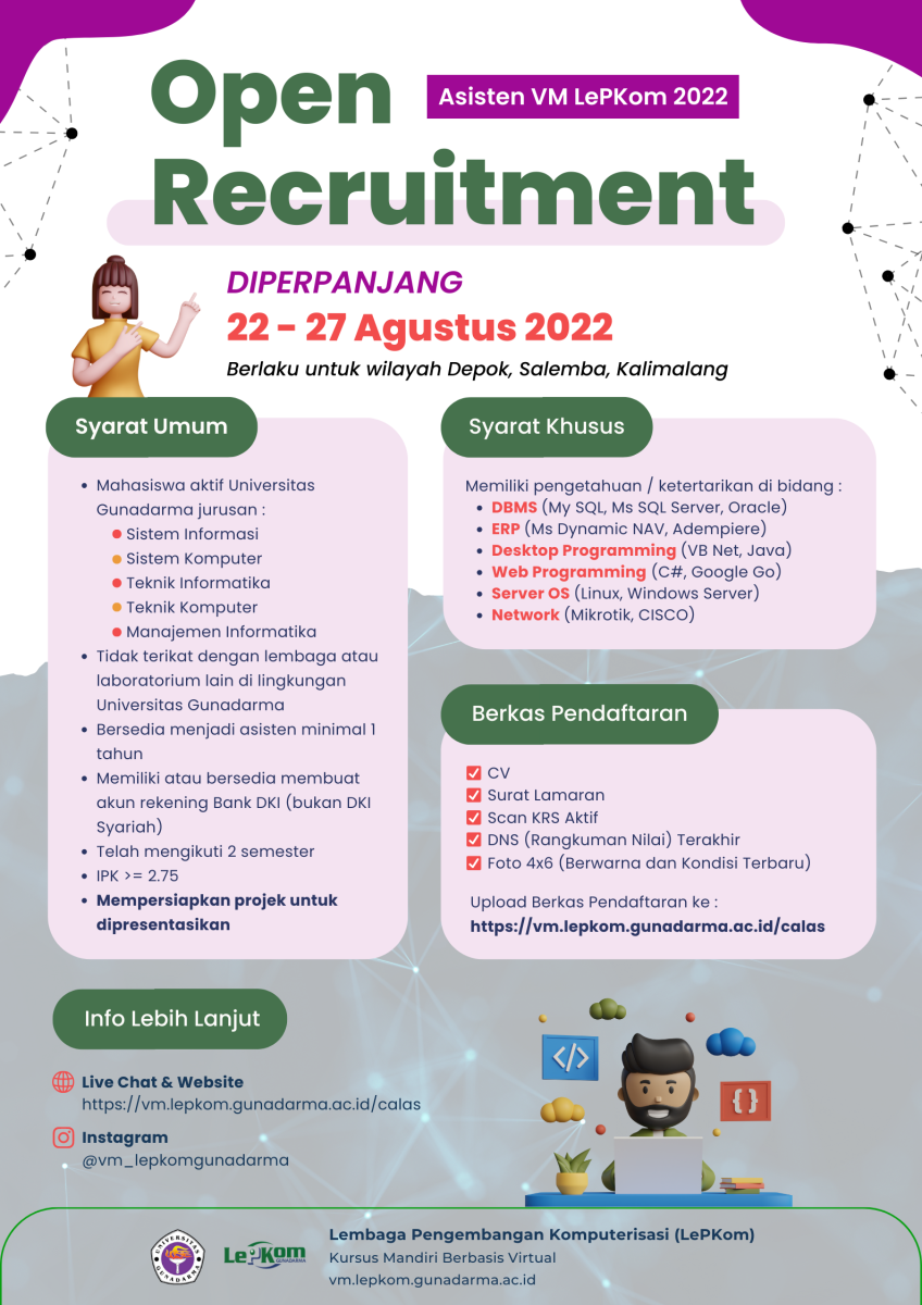 PERPANJANGAN OPEN RECRUITMENT ASISTEN LEMBAGA PENGEMBANGAN KOMPUTERISASI (LePKom) KURSUS MANDIRI BERBASIS VIRTUAL 2022