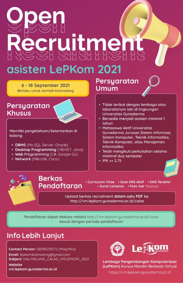 OPEN RECRUITMENT ASISTEN LEMBAGA PENGEMBANGAN KOMPUTERISASI (LEPKOM) KURSUS MANDIRI BERBASIS VIRTUAL 2021 (WILAYAH KALIMALANG)