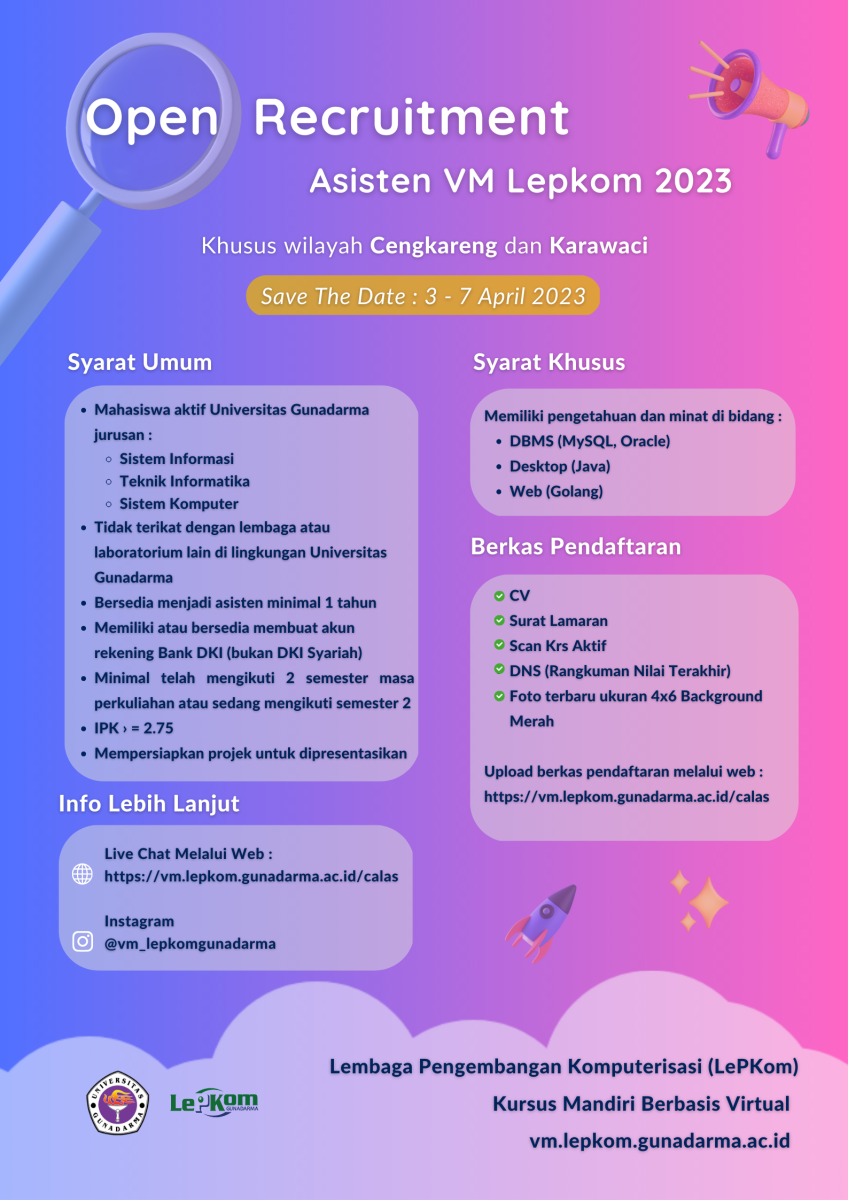 [KARAWACI - CENGKARENG] OPEN RECRUITMENT ASISTEN LEMBAGA PENGEMBANGAN KOMPUTERISASI (LEPKOM) KURSUS MANDIRI BERBASIS VIRTUAL 2023