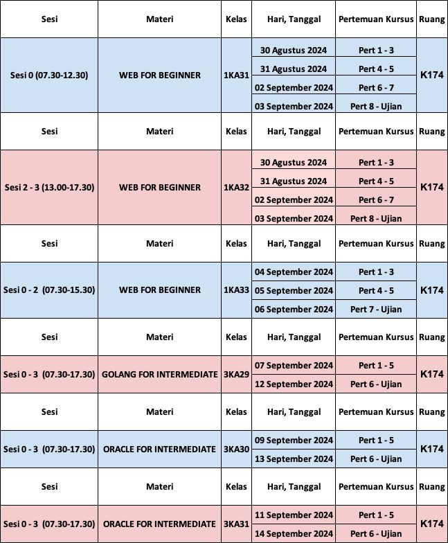 Bahwa kursus periode ATA 2023-2024 akan dilaksanakan secara luring di Laboratorium Komputer Ruang K174. Jadwal kursus dapat dilihat dan diunduh pada file di bawah ini. Mohon dibaca dengan teliti dan seksama perihal jadwal kursus tersebut. Jika terdapat pertanyaan mengenai jadwal kursus ataupun pelaksanaan kursus praktikan dipersilahkan untuk live chat ke web https://kursusvmlepkom.gunadarma.ac.id departemen konfirmasi sesuai dengan jam konfirmasi.